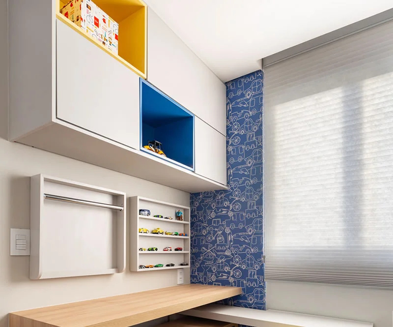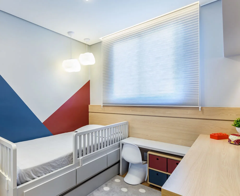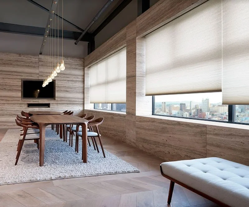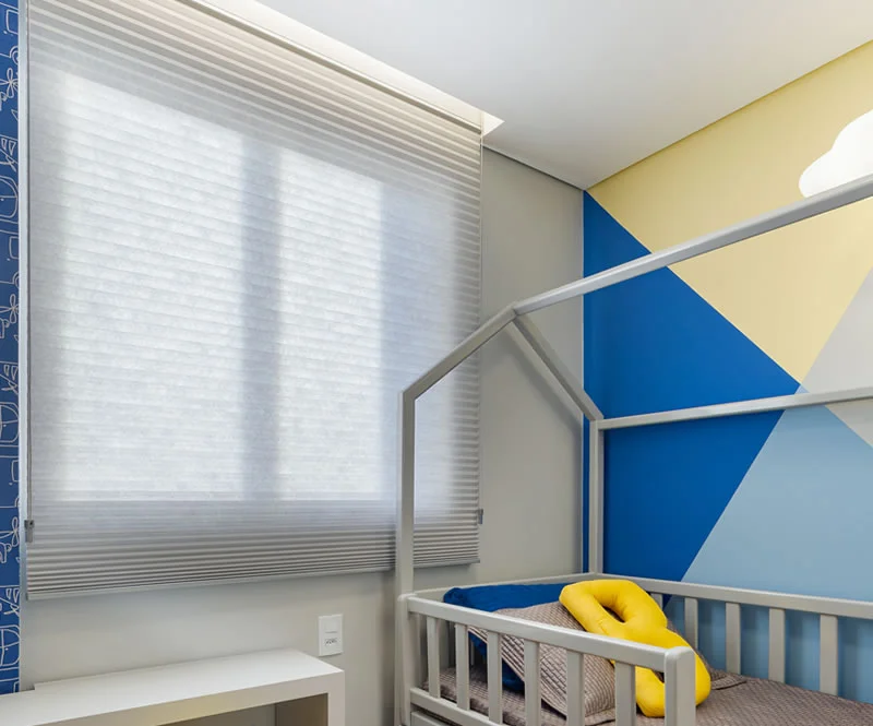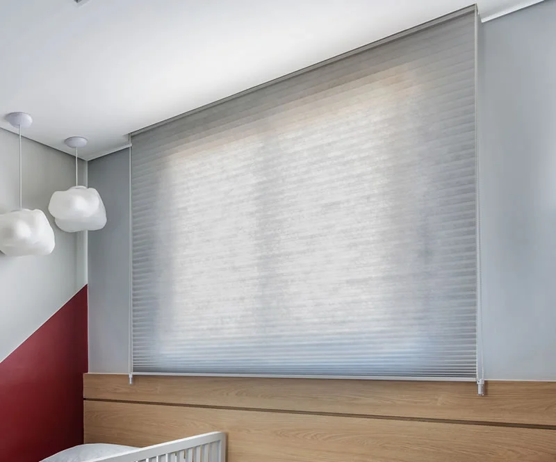 A cortina Celular se destaca pela eficiência no controle da luminosidade e da temperatura dos ambientes. Sua estrutura, composta por células hexagonais- similares ao formato de uma colmeia – forma uma câmara de ar que funciona como isolante térmico. A montagem modular permite o posicionamento de mais de uma peça da cortina Celular, lado a lado, com frestas discretas